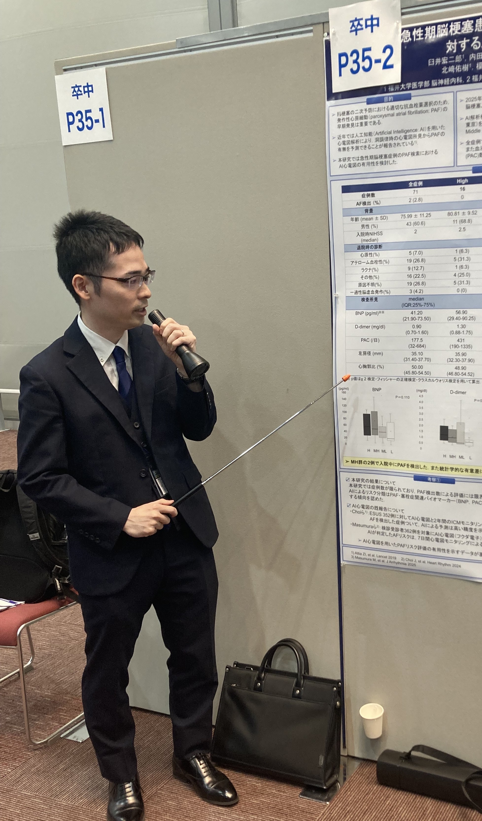 2026年3月12日(木)〜14日(土)に大阪国際会議場にて開催された「第51回日本脳卒中学会学術集会」において、当科の山口先生が口演発表(脳小血管病(CADASIL)について)を、臼井先生がポスター発表(心電図データのAIモデル解析)を行いました。会場では活発な質疑応答が行われ、大変有意義な発表となりました。今後も当科では、西山教授の統括の下、一丸となってより良い脳卒中診療を皆様に提供できるよう、取り組んでまいります。