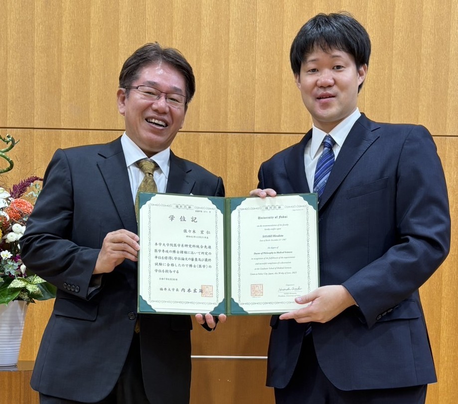 2026年3月23日に本学にて卒業式が執り行われ、当科の佐々木宏仁先生が大学院を修了し、医学博士号を取得されました。こちらは、菊田医学部長との学位授与式後のお写真です。佐々木先生、このたびは誠におめでとうございます!今後ますますのご活躍を心よりお祈り申し上げます。